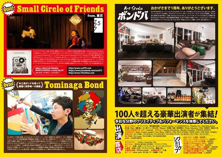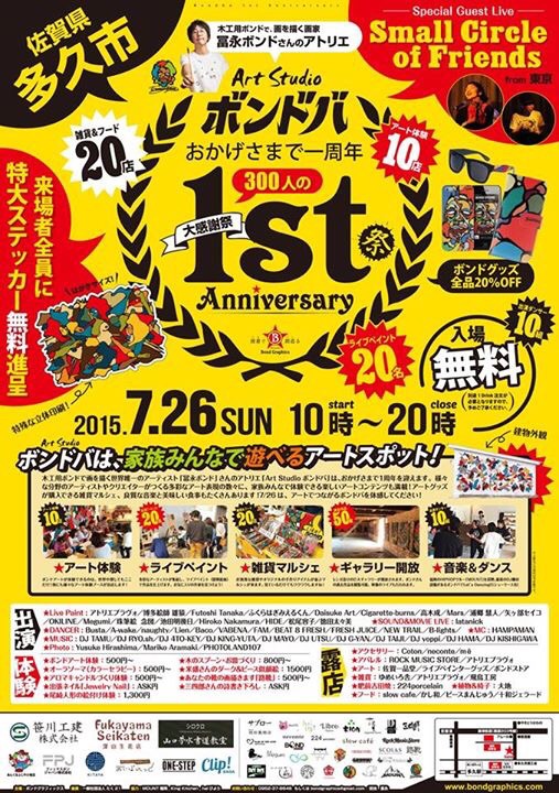 私も光栄ながらそこでライブペインティングで参加します。 すっごいビッグですっごい人が来てノリノリハッピーな時間が過ごせると思います。 あとはお天気になることを祈ります。 皆様もお誘いあわせの上ご来場くださいませ。 ボンドバ1周年☆記念祭 開催日:2015年7月26日(日) 時 間:10時open ~ 20時close 入場料:無料(要1Drink order) 場 所:ボンドバ (多久市北多久町小侍703-21) BOND Graphics https://www.facebook.com/bondgraphics ★★★この日だけの御来場特典★★★ ①冨永ボンド特大ステッカー無料進呈 ②冨永ボンドグッズ全商品20%OFF ③冨永ボンドTシャツ先行発売(数量限定) ④冨永ボンドデザインネイル施術(有料) ★★★★★★★★★★★★★★★★★ 県内外から、芸術・音楽・雑貨マルシェ・映像・ネイル・カラーセラピー・ワークショップ・飲食ブースなど、多彩な分野のアーティストやクリエイターが集結。家族みんなで遊べる体験コンテンツの数々に、記念グッズや来場特典も満載です◎ <ゲストLIVE> ・Small Circle of Friends(from 東京) <ライブペイント出演> ・アトリエブラヴォ ・博多絵師 雄猿 ・ふくらはぎみえるくん ・Futoshi Tanaka ・Daisuke Art ・Cigarette-burns ・高木成 ・Mars ・浦郷 慧人 ・珠筆絵 念図 ・矢ヶ部セイコ ・OKILINE ・Megumi ・Hiroko Nakamura ・池田明後日 ・HIDE ・松尾容子 ・徳田太々美 <みんなで体験!ワークショップ> ・ボンドアート体験 500円~ ・オーラソーマ(カラーセラピー) 500円 ・アロマハンドマッサージ体験 500円 ・アロマキャンドルづくり体験 500円 ・出張ネイル「Jewelry Nail」ASK円 ・木のスプーン・お皿作り1000円~ ・米盛さんのダーク似顔絵 1500円~ ・あなたの靴の画描きます「路靴」500円 ・三四郎さんの詩の書き下ろし ASK円 <DANCER> ・Busta ・A-wake ・Lien ・Baco ・naughty ・FAM and more... <MUSIC> ・DJ TAMU ・DJ 4TO-KEY ・DJ RYO.sh ・DJ G-YAN ・DJ KING-YUTA ・DJ UTSU ・DJ TAIJI ・DJ yoppi ・DJ HAMA ・DJ KISHIGAWA <司会> ・MC HAMPAMAN <Sound&Movie Live> ・latanick <Photograph> ・Yusuke Hirashima ・PHOTOLAND107 ・Mariko Aramaki <雑貨&グッズ販売> ・ボンドストア(スマホカバー&アパレル) ・Coton(アクセサリー) ・ゆめいろ舎(雑貨) ・アトリエブラヴォ(雑貨&アパレル) ・アートブース(ライブペインターグッズ) ・飛鳥工房(木製雑貨) ・ROCK MUSIC STORE(ギター&アパレル) ・224 porcelain(肥前吉田焼き) ・neconte(アクセサリー) ・佐賀一品堂(アート) <フードブース> ・slow cafe(パスタ&パン) ・かし和(からあげ&カレー) ・十和(ジェラード) ・ピースまんじゅう(まんじゅう) <生放送番組ブース> ・ふくらはぎみえるくんの「ふふふTV」 ~生で10時間ぶっ通し配信スペシャル~ お問合せ:0952-37-8646/ボンドグラフィックス メール問い合わせ:bondgraphics@gmail.com https://www.facebook.com/bondgraphics ☆二人展のお知らせ☆ みずみずしい水彩画が魅力的なアーティスト YU_MI(ゆうみ)ちゃんと、 以下は詳細です。 YU_MI×矢ヶ部セイコ 8月8日(土)〜8月20日(木) *13日お休み 「いつもいっつもまるばっかりじゃいられない。 ◎を目指して、今日も女を走り切る! 夏の香りを思い出す、ちょっぴり大人に、ちょっぴり刺激的な女の子たちを描いた二人展です。」