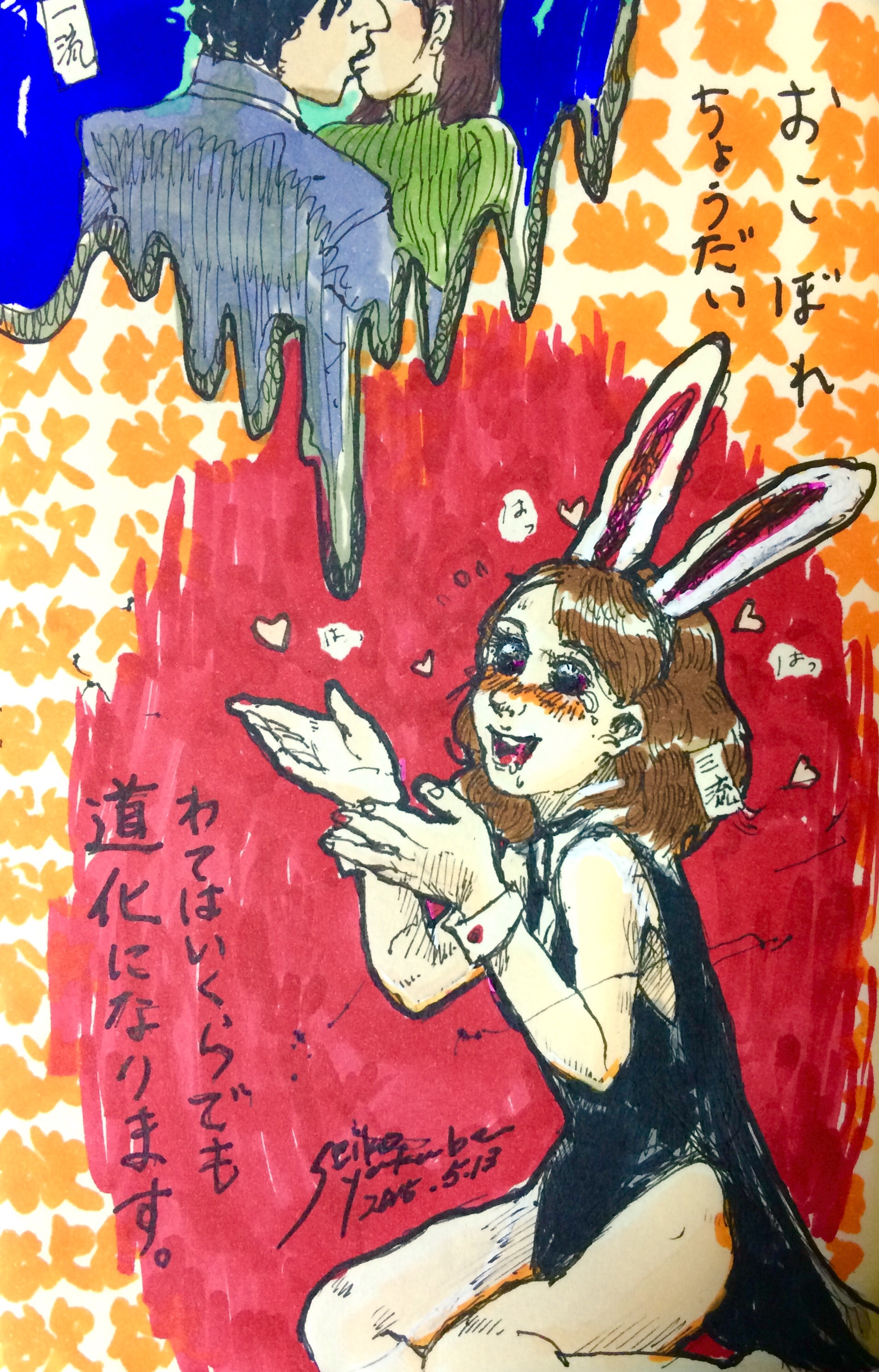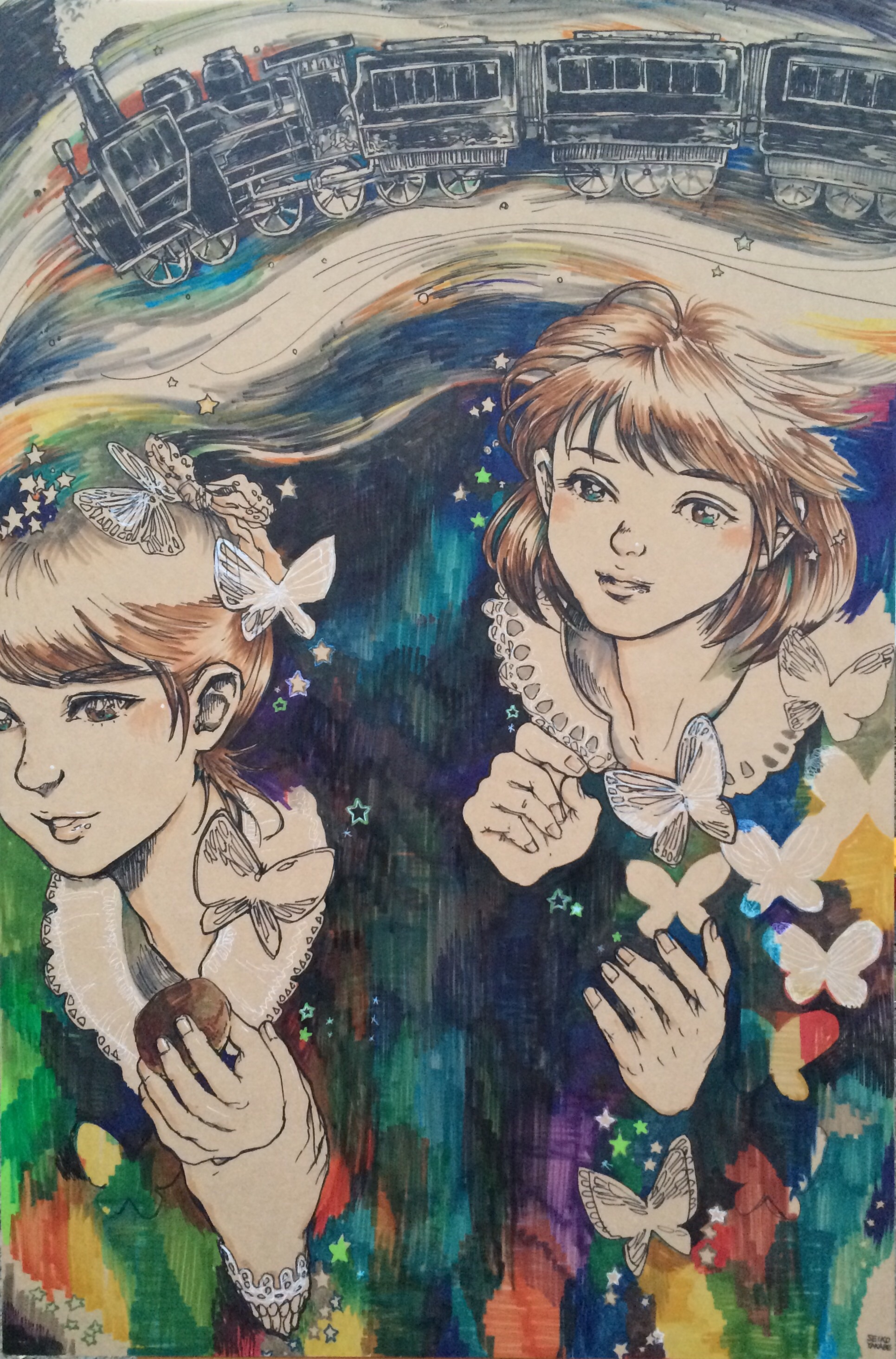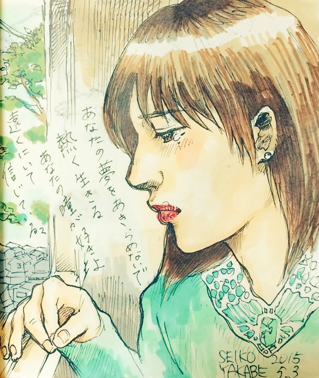 先月には色つけまでできなかったので色も付けてきました。 2015.5.24 「銀河鉄道の夜」 だんだん充実してきて描くのが楽しくなってきました! 次はネガティブなネタのリクエストが・・・w さて何描こうかな! 私は次回のボンドバ開放日にはおりません。 その日6月28日はAMPアトリエにてヌードデッサン会になっております。 メンズモデルですwww 参加者も募集しております!ぜひ。 ボンドバさんでしてもらったハーブアロマセラピー。すっごくよかった。 私のこのあふれ出るリア充ソングを余すことなく人に聴かせてやりなさいってさ!(こんな説明ではないがw) この喜び幸せ希望を疑ったり、いやそうではないとネガティヴに考える、とらえるところが私にはある。それがずばり私のネガティヴな印象なんだって。言い当てられたw というわけで幸せなら幸せと、エネルギーあふれる作品を作っていこうと思います。 もっとあるがままに私らしく私のままで。 ボンドバのみなさん、ハーブアロマセラピーの方ありがとうございました! 以下 こちらからは普通に日記。 27日には仕事の後速攻でゲスの極み乙女。のライブにZEPP FUKUOKAへ行ってきました。 さいっこうによかったです!課長の首振りが特によかったw いこかちゃんまじかわいい。ちゃんMARIの体の張り具合もよかった。 絵音君は声高かったーーーうますぎ。 みんな本当に演奏上手だった。 MCも面白いしすべてがイケてた。すごくいい刺激になった。 同い年くらいであそこまでのプロ意識。プロ。レベル高い。なのにまだまだ伸びると思わせるポテンシャルの高さ・・・ドキドキしっぱなし。すごいわゲスの極み乙女。!! これは作風変わるな! 自分の創作も楽しみになった。ふっふっふ。面白いものつくるぞ。 さて夏の二人展に向けて制作するんでそろそろアドュ。 七月にindigo la End 八月にSuperflyと長渕剛さんのライヴに行くんで それまで大好きな音楽たち聴いて歌ってガンガン制作するぞ! アラサーーー たのしい夏が近づいている! 一日一枚落書き 「本当のゲスって何かわかる?」 私は知ってしまった! 私は正真正銘の ゲス だってことを! ま、いっか。 PR 最近の悩みはFacebookのタイムラインをスクロールするだけで30分以上かかっていること 情報多いんだか少ないんだか。 あんまり読んでないと、リアルの会話で あれ?Facebookにも書いてたけど? って言われるやつよね。 私も あれ?読んでない?記事書いてたよ て言ったりするけど、自分自身でも皆さんの流し読みしたりすること多いような… 友達増えまくった最近は特に… 前にいいね全然つけてこんなこいつって思ってた人おって、 なんでー?って聞いてみたら Facebookやりにくくない?って言ってた人いた 多分その方総勢1000人くらい友達がいたんだろうな… 私は450人程度の友達数でこのうんざりする状態。なら、その方の煩わしさ、今ならわかるかも。大変そう…。 友達や いいねをしたFacebookページの数が増えれば増えるほどスクロールする時間がまた増えるんだろうかと思うとちょっと…… じーんわり Facebook離れも考えちゃうね(笑) かと言って友達をないがしろにするつもりはないんだけど。 何事もさくさくせんと無駄が多いということなんだな。 っていうのをダラダラ深夜に考える私はくだらない(笑)